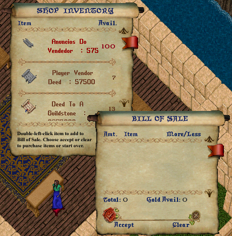 Com este Sistema os jogadores poderão colocar seus itens à Venda. Temos vários balcões de venda em Trinsic, para colocar um vendedor basta comprar uma concessão de vendedor, que pode ser encontrada em Trinsic mesmo, bem como pergaminhos de anúncio.